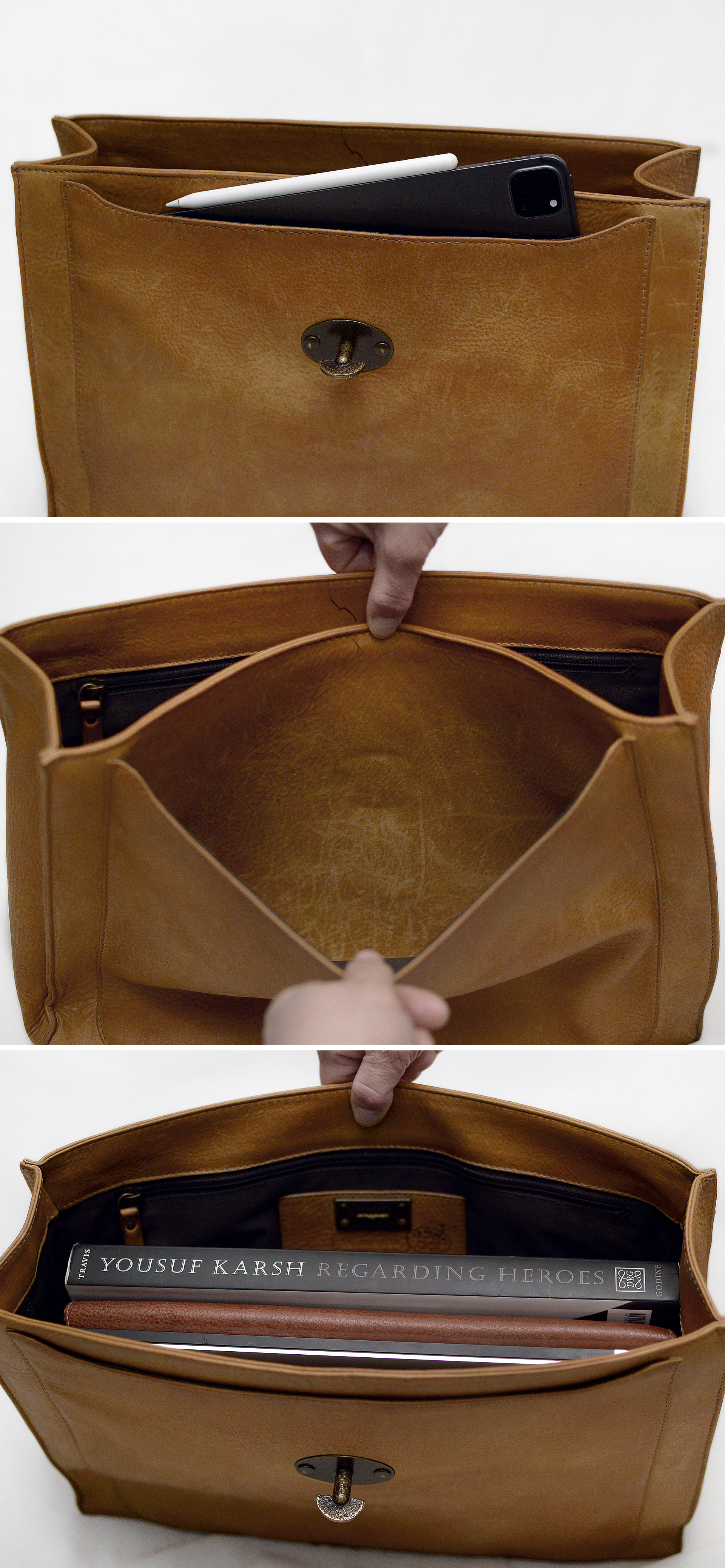 정도의 미디움 라지급 사이즈로 A4 서류파일 및 15-16인치급 노트북 여유롭게 수납 가능합니다. 넓은 메인 파티션과 다양한 내.외부 포켓 구성 다채롭게 잘 되어있어 깔끔하고 효율적인 수납 가능해 멋스러운 유러피안 클래식 스타일의 브리프케이스 서류가방부터 핸들 고리 부분에 따로 숄더.크로스 스트랩등 연결해 숄더.크로스 형태로 사용하는 일상용 데일리백까지 다용도로 두루 편하게 쓰기 좋습니다. 천연 베지터블 레더 소재 특유의 경년변화에 따른 태닝.에이징등 자연스러운 사용감 정도 있으나 사용 전후로 꾸준히 가죽 에센스로 잘 관리해줘 가죽 상태 잘 유지했고 찢김.뜯김등 큰 파손.훼손없이 전체적인 상태 양호합니다.