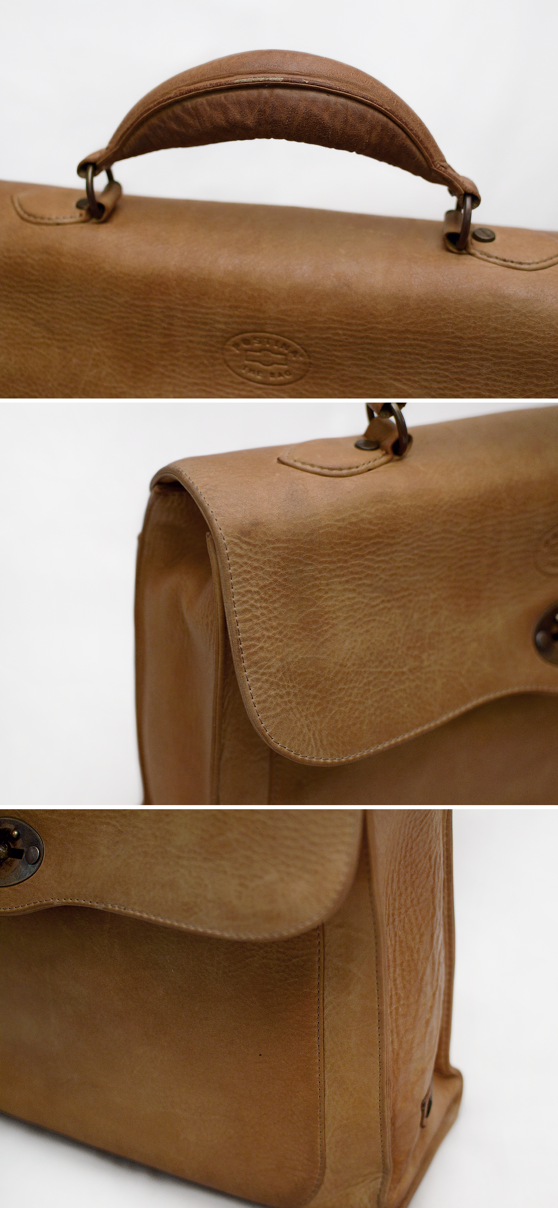 이탈리아 북동부 바첸자 지역을 기반으로 하는 가죽 수공예 명품 브랜드 자넬라토의 이탈리안 포스트맨 클래식 가죽 브리프 케이스입니다. 국내에서는 신민아 백으로 유명한 포스티나백으로 유명한 자넬라토의 이태리 현지 모델로 가장 클래식한 전통 유러피안 스타일의 원핸들 가죽 브리프케이스 형태에 자넬라토 특유의 유선형 라운디한 플랩 스타일과 턴락 잠금장치등 브랜드 아이덴티티 잘 보여주고 가공 최소화한 카멜 브라운 컬러 최고급 이탈리안 천연 소가죽 토스카나산 바케타 (vacchetta) 레더 특유의 부드러운 광택감과 고급스럽게 매트한 질감 시간 지날수록 자연스러운 태닝.에이징 더해서 더더욱 아름답게 익어나는 가죽 파티냐의 아름다운 컬러감 훌륭합니다.