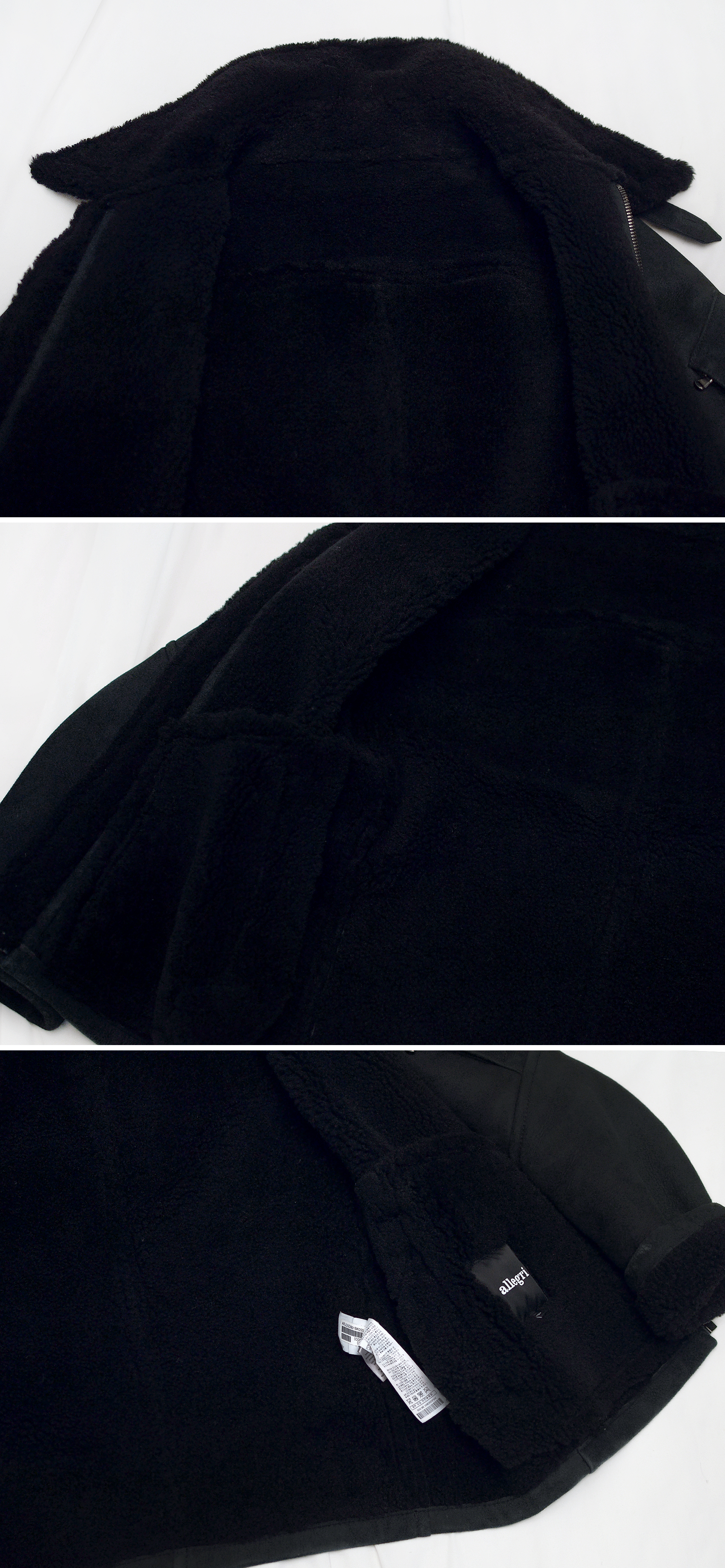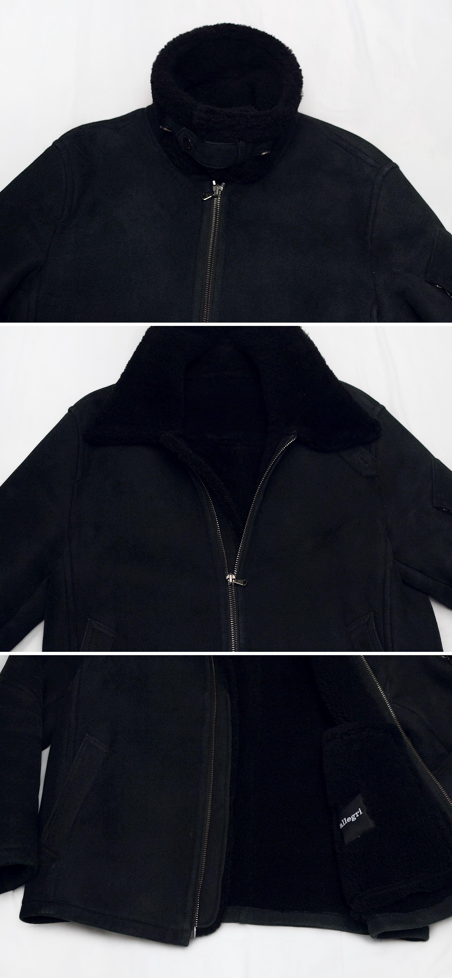 국내에는 LF (구 LG 패션) 에서 전개하는 최고급 라인 이탈리아 하이 컨템포러리 브랜드 알레그리의 올블랙 모던에센셜 천연 양가죽 양털 무톤 자켓 숏무스탕 입니다. 아키텍츠 오브 패브릭스(Architects of Fabrics) 라는 슬로건으로 2천가지가 넘는 직물을 연구해 최상의 혁신적인 소재를 찾고 활용하는 브랜드답게 최상급 소재와 모던 클래식한 기능성 시티 스타일 디자인 깔끔하고 멋스러운 알레그리의 아이덴티티로 재해석한 무스탕 자켓으로 일반적인 클래식 무스탕 자켓의 대표적인 스타일인 B-3 에비에이터 무스탕 자켓의 박력있고 멋스러운 디자인 스타일을 베이스로 하면서도 좀 더 깔끔한 느낌의 MA-1 숏 항공자켓의 패턴과 디자인 요소를 더해 실착시 지나치게 부하고 과하지 않은 깔끔한 핏과 올블랙 컬러로 멋스럽게 떨어지는 최고급 모던 클래식 스타일 숏기장 무톤 자켓입니다. 발매가 200만원 중반대 알레그리 브랜드 최고급형 아우터답게 부드럽게 샌딩 처리되어 은은한 광택감과 실키한 질감의 통가죽 램스킨 겉감에 천연 양털 시어링 안감까지도 블랙 컬러로 깔끔한 일체감 매우 좋고 명품 람포 (LAMPO) 지퍼등 소재 및 부자재와 만듬새 훌륭합니다.