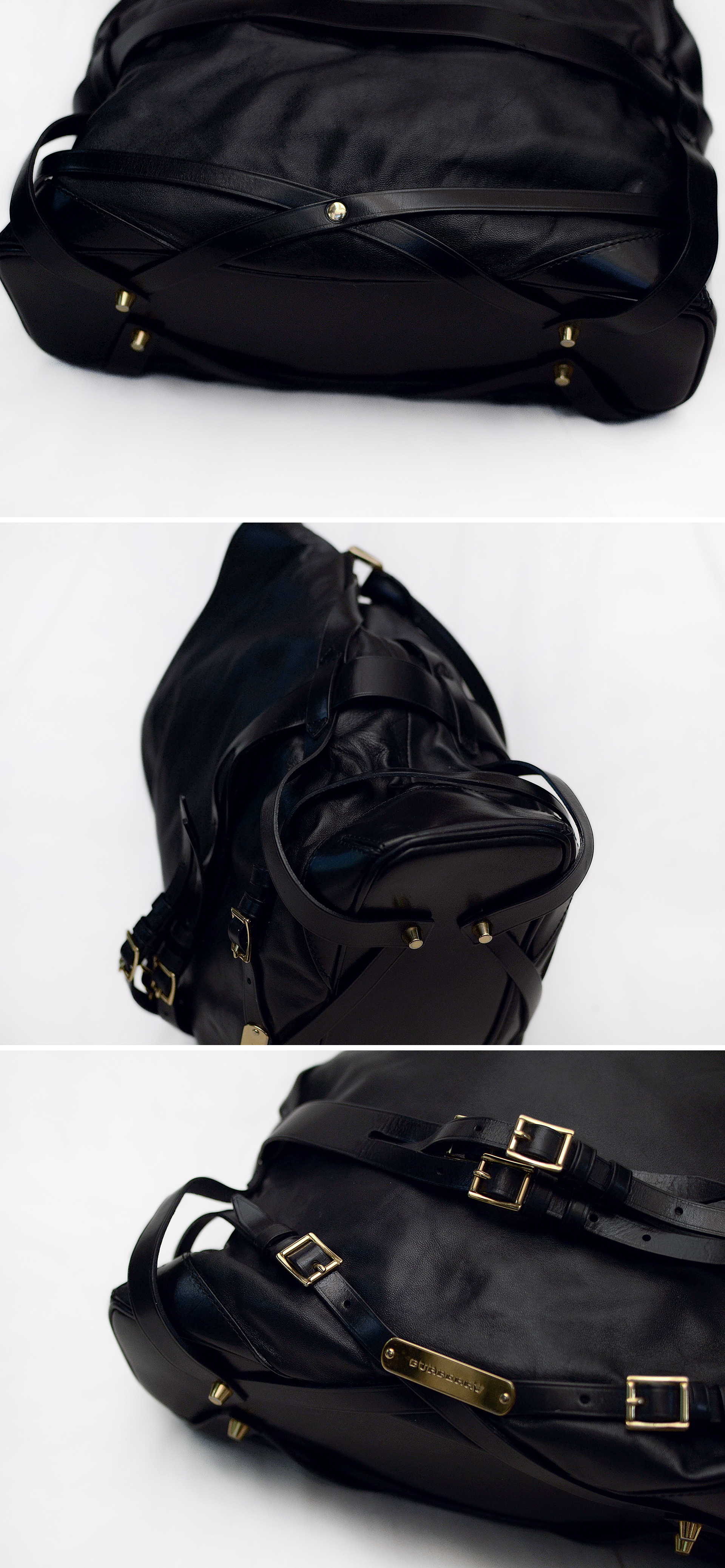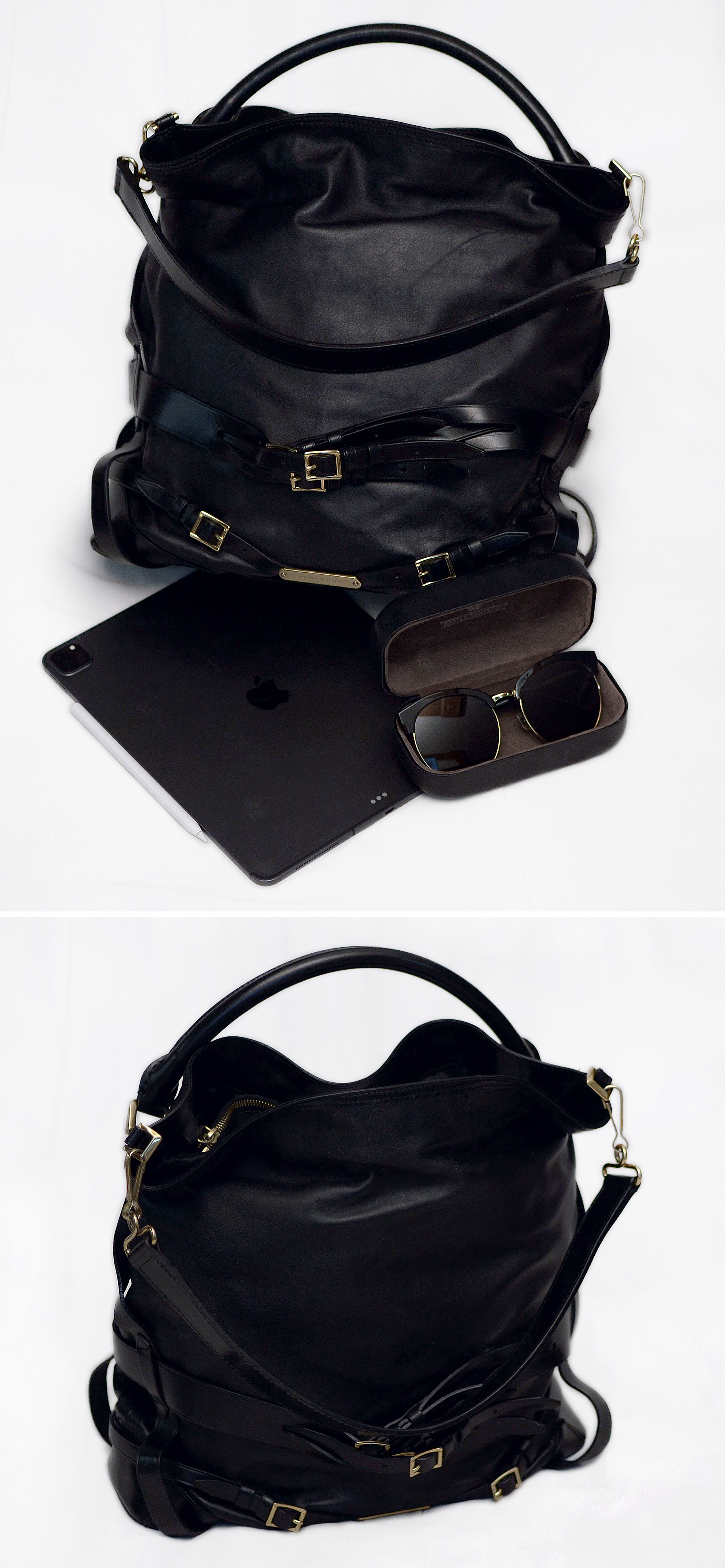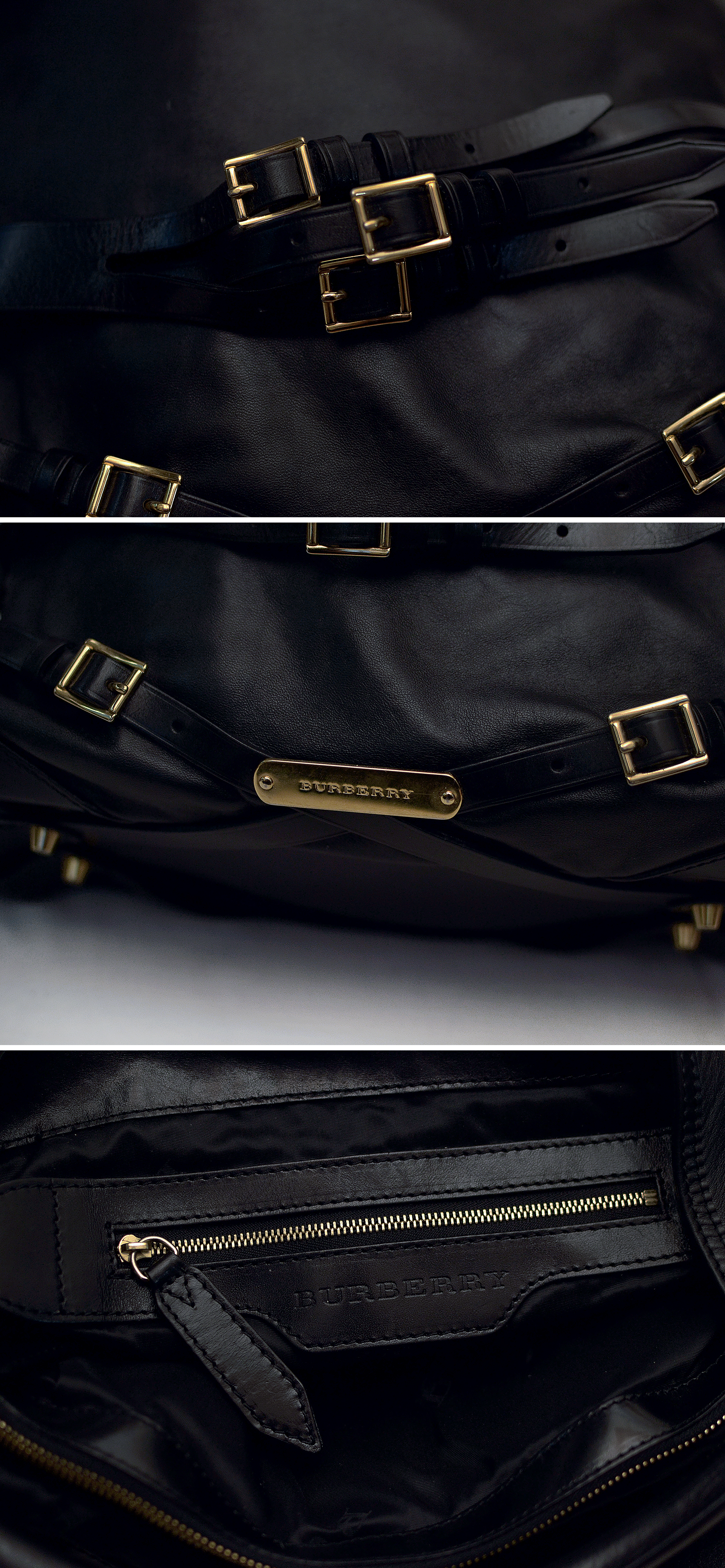 버버리 고스포드 블랙 레더 버전입니다. 클래식 체크 캔버스 소재의 일반 고스포드 버전의 상급 모델로 블랙 컬러 최상급 나파 레더 램스킨으로 실키한 촉감과 부드럽고 유연하면서도 무겁지 않게 가벼운 양가죽 메인 바디 소재에 탄탄한 소가죽 브라이들 레더 벨티드 장식 조합으로 클래식 하면서도 멋스럽습니다. 바닥 부분 탄탄하게 받쳐주고 가방 전체를 감싸주는 가죽 벨트들은 귀족적인 마구 스타일의 장식적 요소뿐만 아니라 부드럽고 유연한 메인 바디 소재를 외골격 형태로 탄탄하게 잡아줘 형태 무너지지 않게 기능하는 멋스럽고 유니크한 스타일 입니다. 튼튼한 롤타입 핸들과 탈부착 가능한 숄더스트랩 있어 토트.숄더로 자유롭게 들 수 있고 드는 방식이나 수납품에 따라 자연스럽게 쉐입 잡히는 형태로 정장.캐쥬얼 어떤 착장에도 잘 어울리고 클래식한 블랙컬러에 금장 하드웨어 조합이라 유행 상관없이 두고 두고 쓰기 좋습니다.