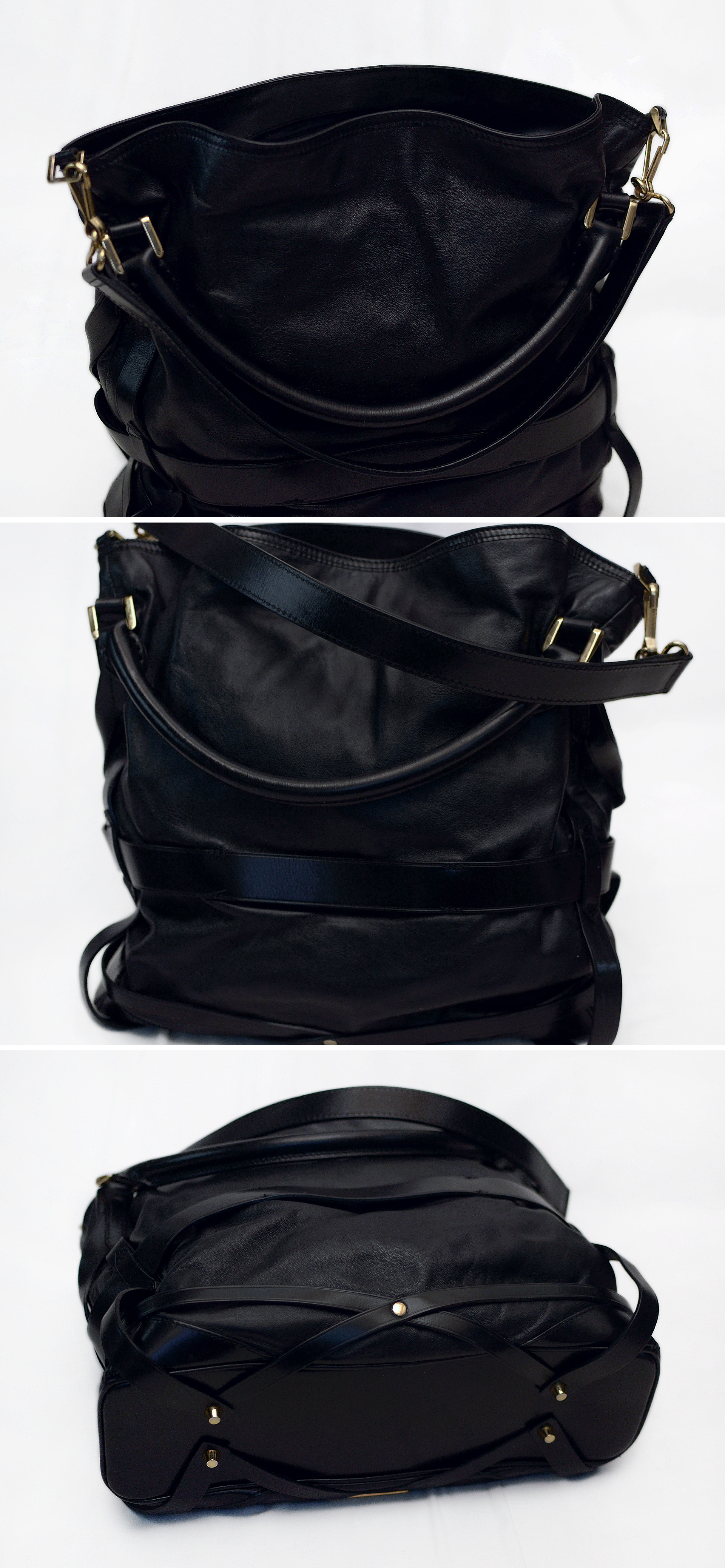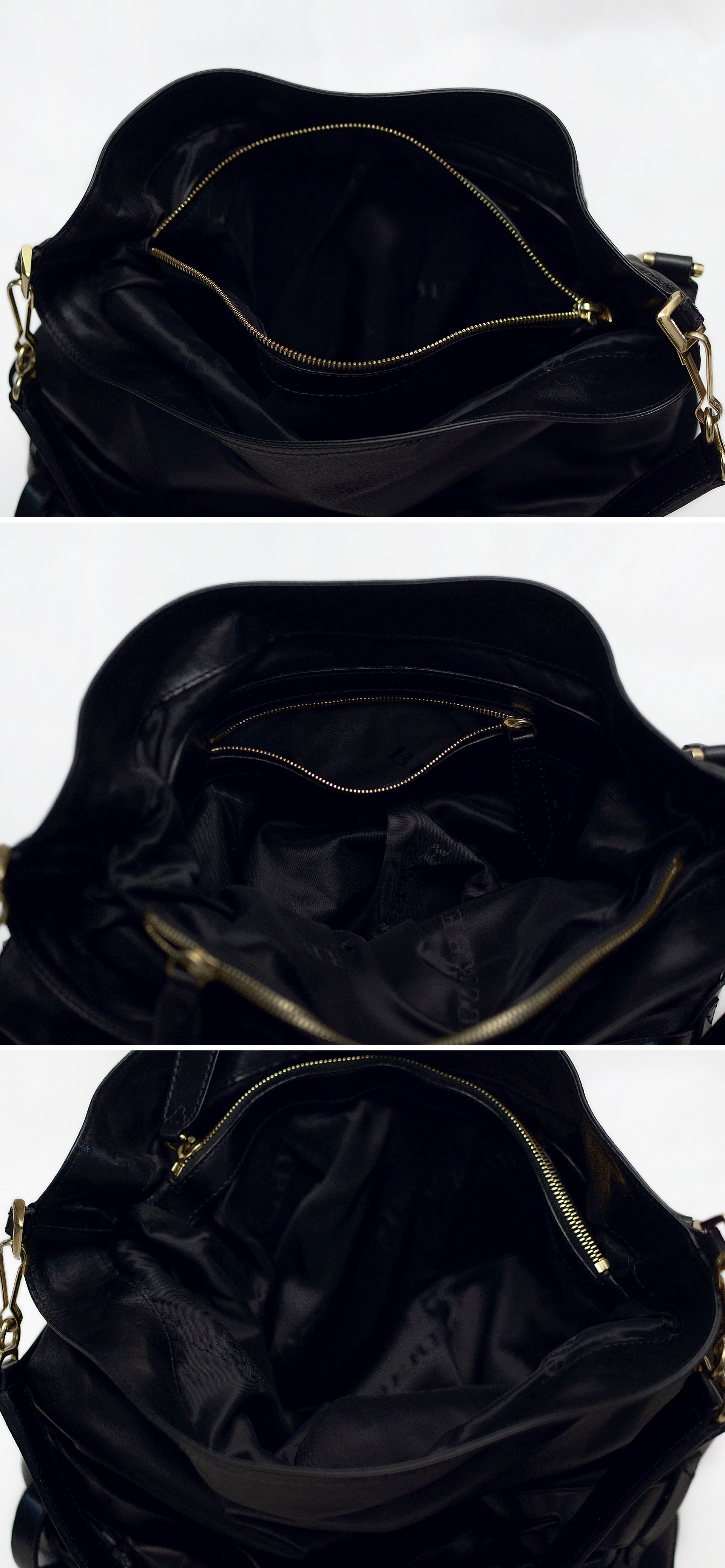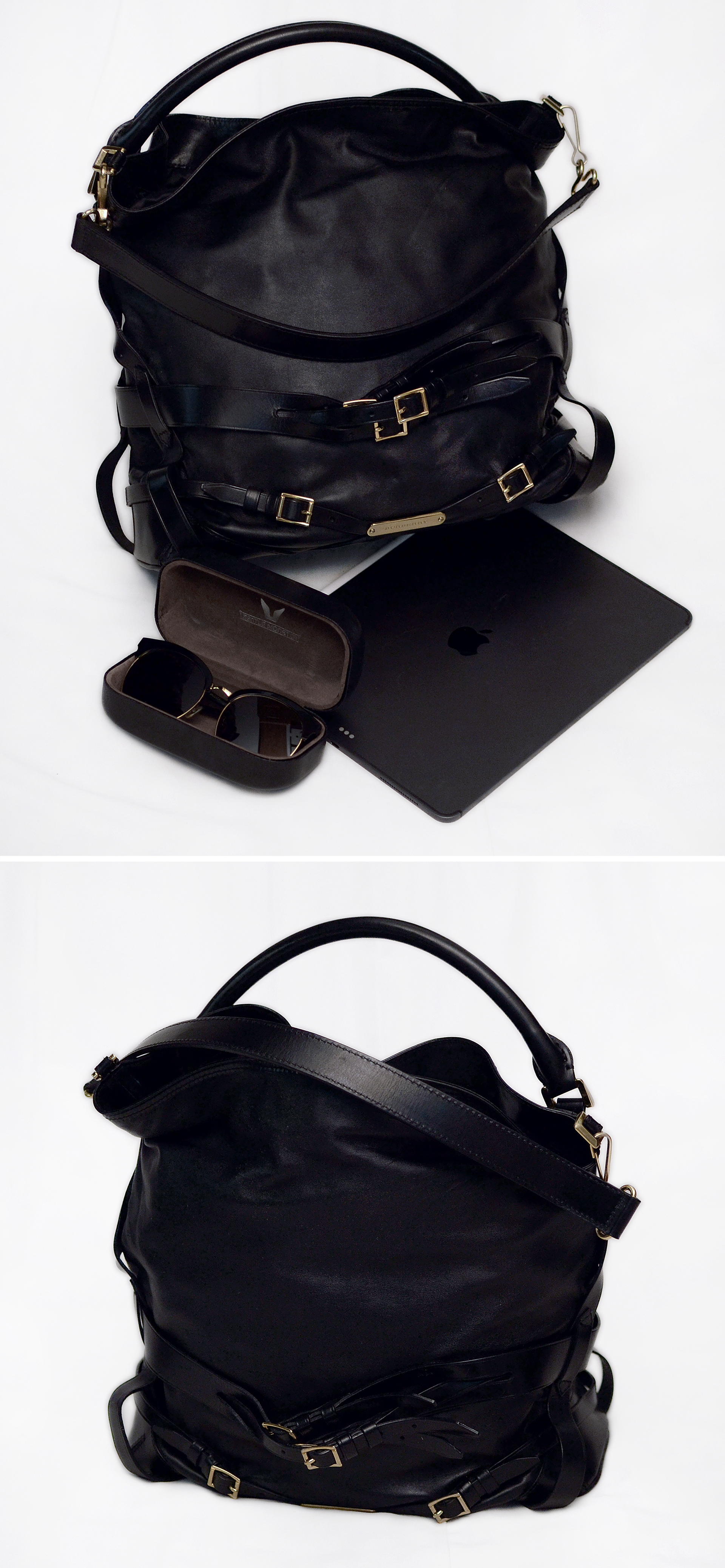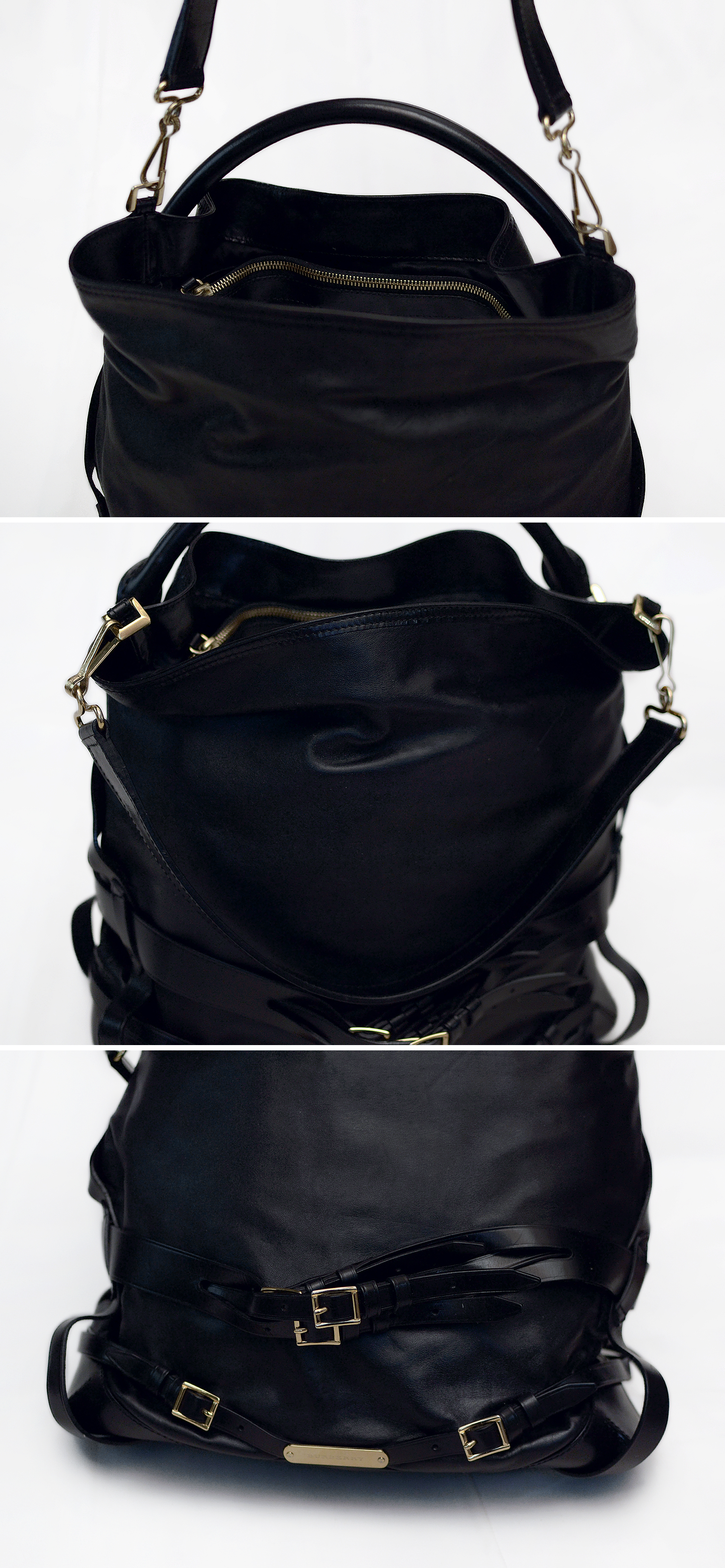 버버리 고스포드 블랙 레더 버전입니다. 클래식 체크 캔버스 소재의 일반 고스포드 버전의 상급 모델로 블랙 컬러 최상급 나파 레더 램스킨으로 실키한 촉감과 부드럽고 유연하면서도 무겁지 않게 가벼운 양가죽 메인 바디 소재에 탄탄한 소가죽 브라이들 레더 벨티드 장식 조합으로 클래식 하면서도 멋스럽습니다. 바닥 부분 탄탄하게 받쳐주고 가방 전체를 감싸주는 가죽 벨트들은 귀족적인 마구 스타일의 장식적 요소뿐만 아니라 부드럽고 유연한 메인 바디 소재를 외골격 형태로 탄탄하게 잡아줘 형태 무너지지 않게 기능하는 멋스럽고 유니크한 스타일 입니다. 튼튼한 롤타입 핸들과 탈부착 가능한 숄더스트랩 있어 토트.숄더로 자유롭게 들 수 있고 드는 방식이나 수납품에 따라 자연스럽게 쉐입 잡히는 형태로 정장.캐쥬얼 어떤 착장에도 잘 어울리고 클래식한 블랙컬러에 금장 하드웨어 조합이라 유행 상관없이 두고 두고 쓰기 좋습니다.