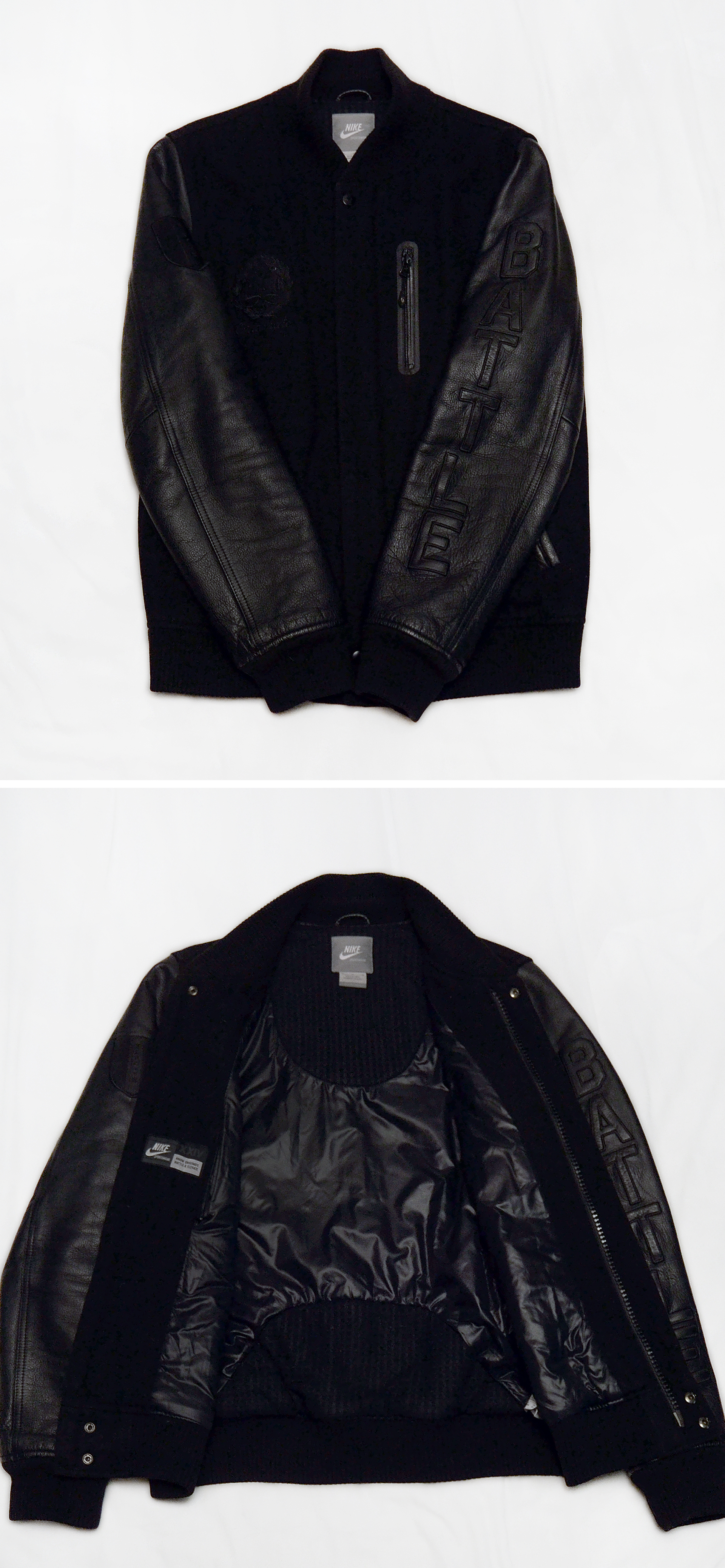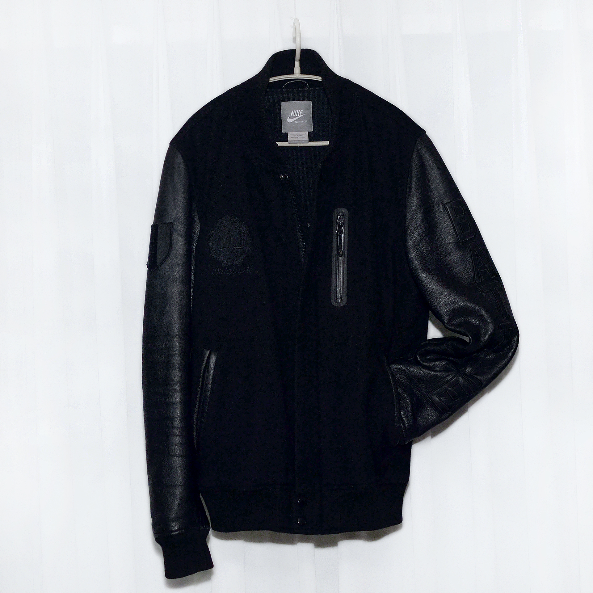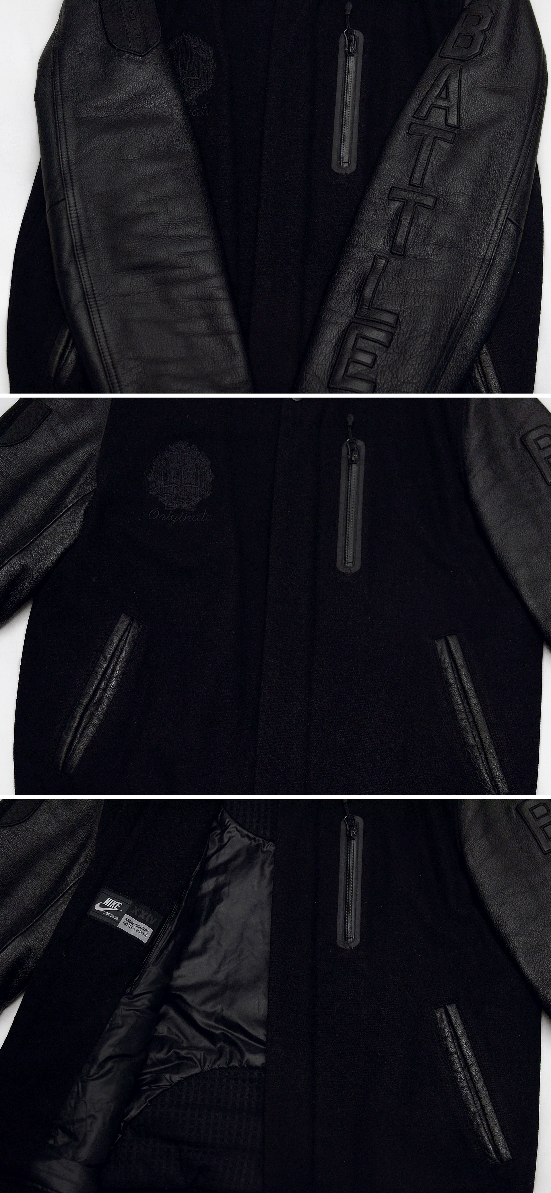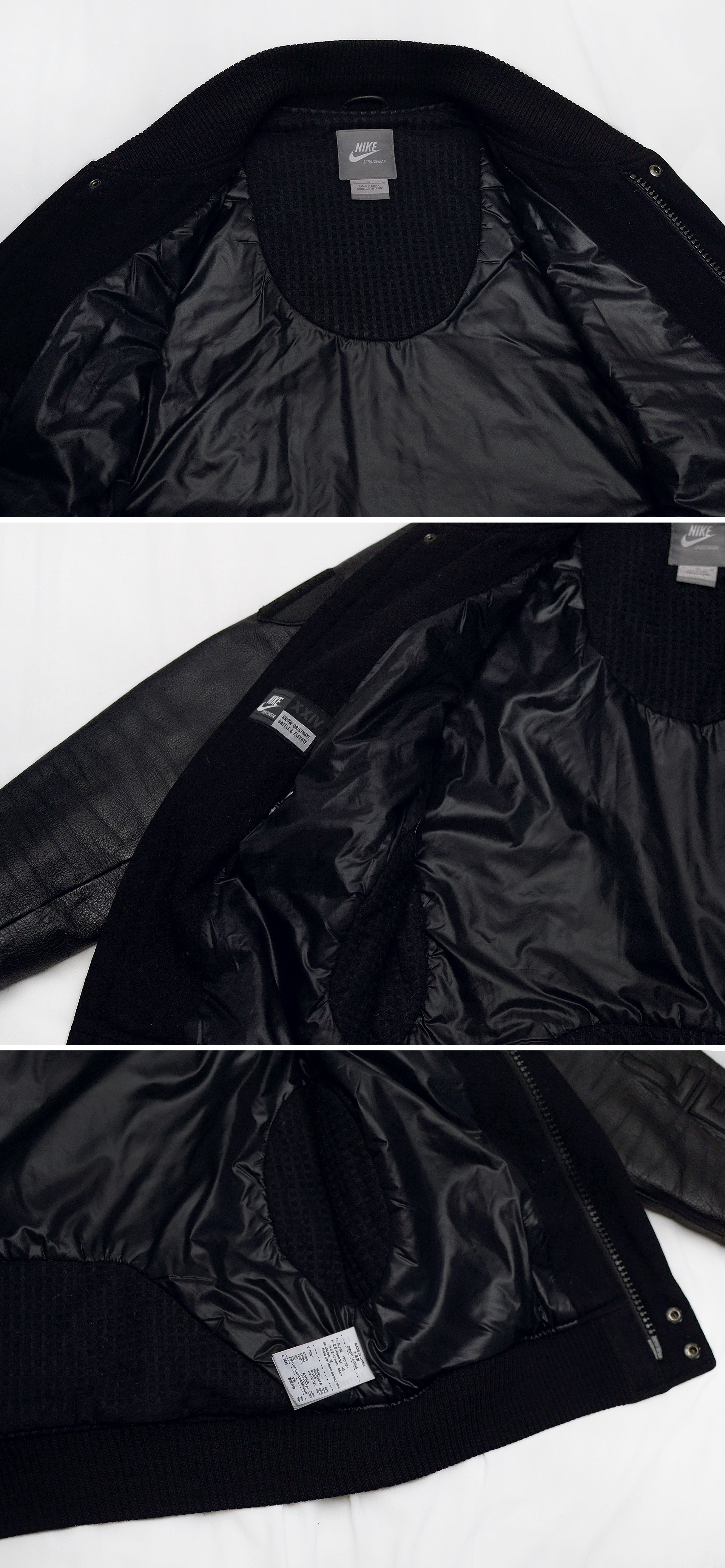 나이키 (NIKE) 고급형 토털웨어 NSW 라인의 대표 고급형 자켓으로 일명 스타장.파괴장 이라 불리는 디스트로이어 자켓 시리즈중 코비 브라이언트 자켓입니다. 바디울 소재에 천연가죽 슬리브를 가지는 클래식한 스태디움.바시티 자켓 형태에 올블랙.올검 컬러웨이로 묵직하고 존재감 넘치는 나이키 NSW 라인의 대표작인 디스트로이어 자켓을 일명 블랙맘바라 불렸던 NBA 의 전설적인 플레이어인 코비 브라이언트 시그니쳐 에디션으로 나온 제품으로 등 부분에 코비의 백넘버 24번을 로마자로 표기한 가죽 패치 되어 있고 가슴.팔 부분에 코비를 상징할 수 있는 여러가지 자수.가죽 패치웨어들 (Know / Originate / Battle / Elevate = KOBE) 을 더해 멋스럽게 연출되어 있습니다.