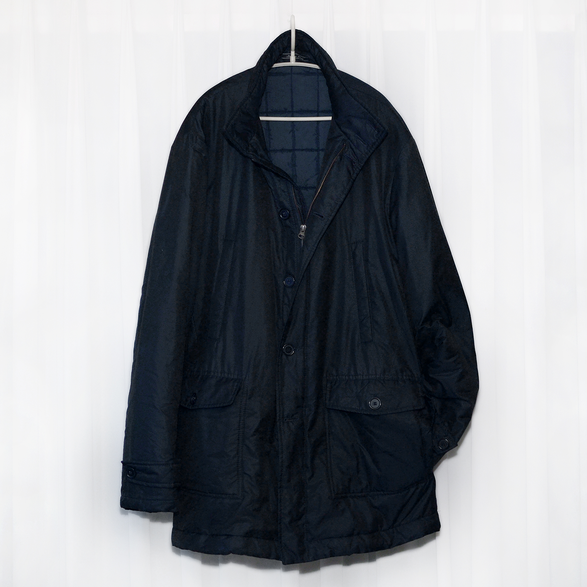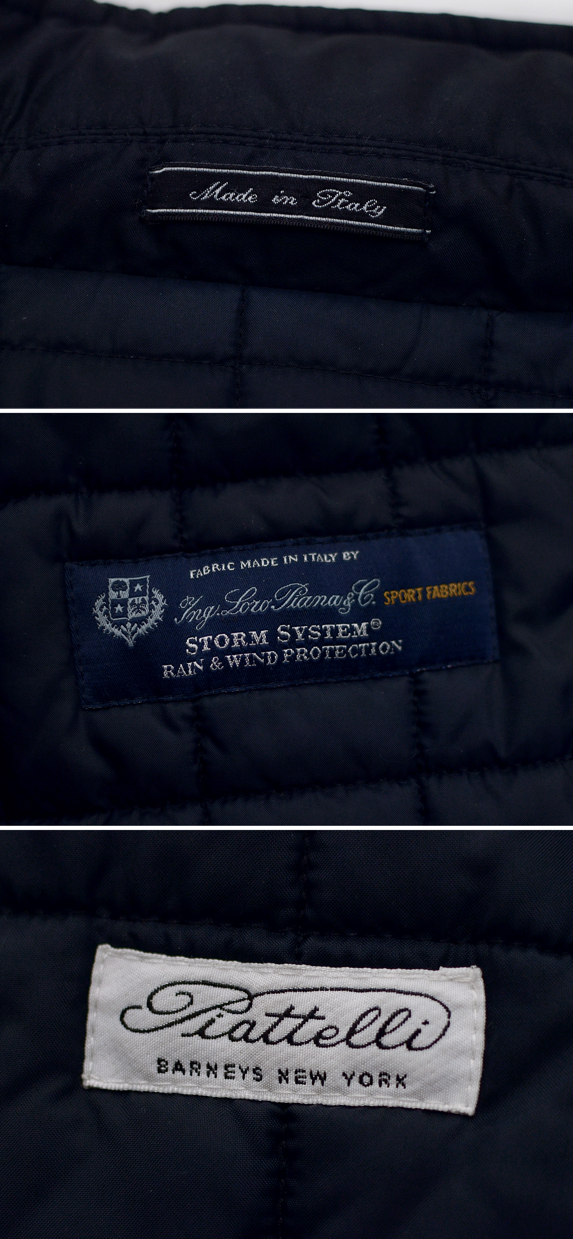 피아텔리 로로피아나 (Loro Piana) 스톰시스템 (STORM SYSTEM) 스포츠 패브릭 구스다운 패딩 코트 자켓입니다. 뉴욕 럭셔리 하이엔드 패션을 리드하는 미국의 고급 백화점 바니스 뉴욕 스페셜 테일러 라인으로 발매된 최상급 이태리 메이드 패딩 코트 자켓으로 태풍이 불어치는 상황에서도 견딜 수 있다는 이름처럼 최고의 방수방풍 기능성 원단이면서도 로로피아나다운 고급스러운 소재감과 짙은 다크 네이비 컬러의 실키한 광택감 돋보이는 스톰 시스템 스포츠 패브릭 소재에 명실상부 최상급 다운인 헝가리 구스다운 소재 충전재 패딩 안감 조합으로 되어있어 그야말로 무게감 거의 느껴지지 않을만큼 깃털처럼 가벼우면서도 실착시 놀랍도록 뛰어난 착용감과 보온성 매우 좋은 이 느낌은 정말 입어보지 않으면 모릅니다.