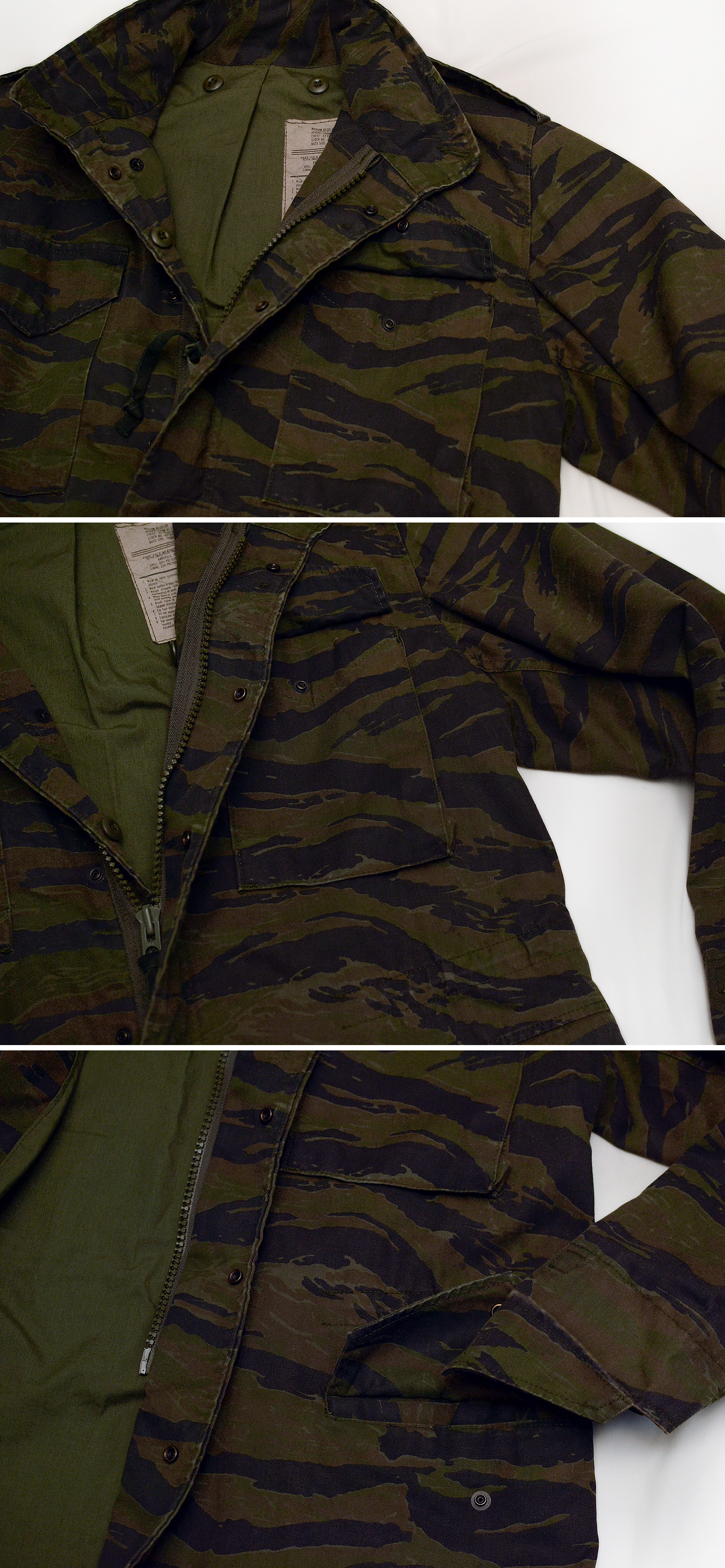 미군 대표 군납 의류 업체로 시작된 근본 밀리터리 스타일 의류 브랜드 알파 인더스트리의 타이거 카모플라쥬 패턴 M-65 야상 필드자켓입니다. 일반적으로 많이 보이는 민무늬나 흔히 개구리라고 불리는 우드랜드 카모패턴이 아닌 6-70 년대 베트남 전쟁 당시 미군 특수부대에게만 소량 지급되었던 흔치않은 타이거 카모플라쥬 패턴으로 유니크하고 멋스럽습니다. 요즘 나오는 패션 아이템으로 원가 절감해 스타일만 남은 중국 라이센스 생산품 아닌 오리지널 메이드인 USA 제품으로 군용 기능성 원단의 상징같은 내구성 뛰어나고 착용감 좋은 폴리65 코튼35 혼용률 립스탑 조직 10-11온스급 트윌코튼 소재와 타협없는 탄탄한 만듬새 훌륭하고 멋스럽습니다.